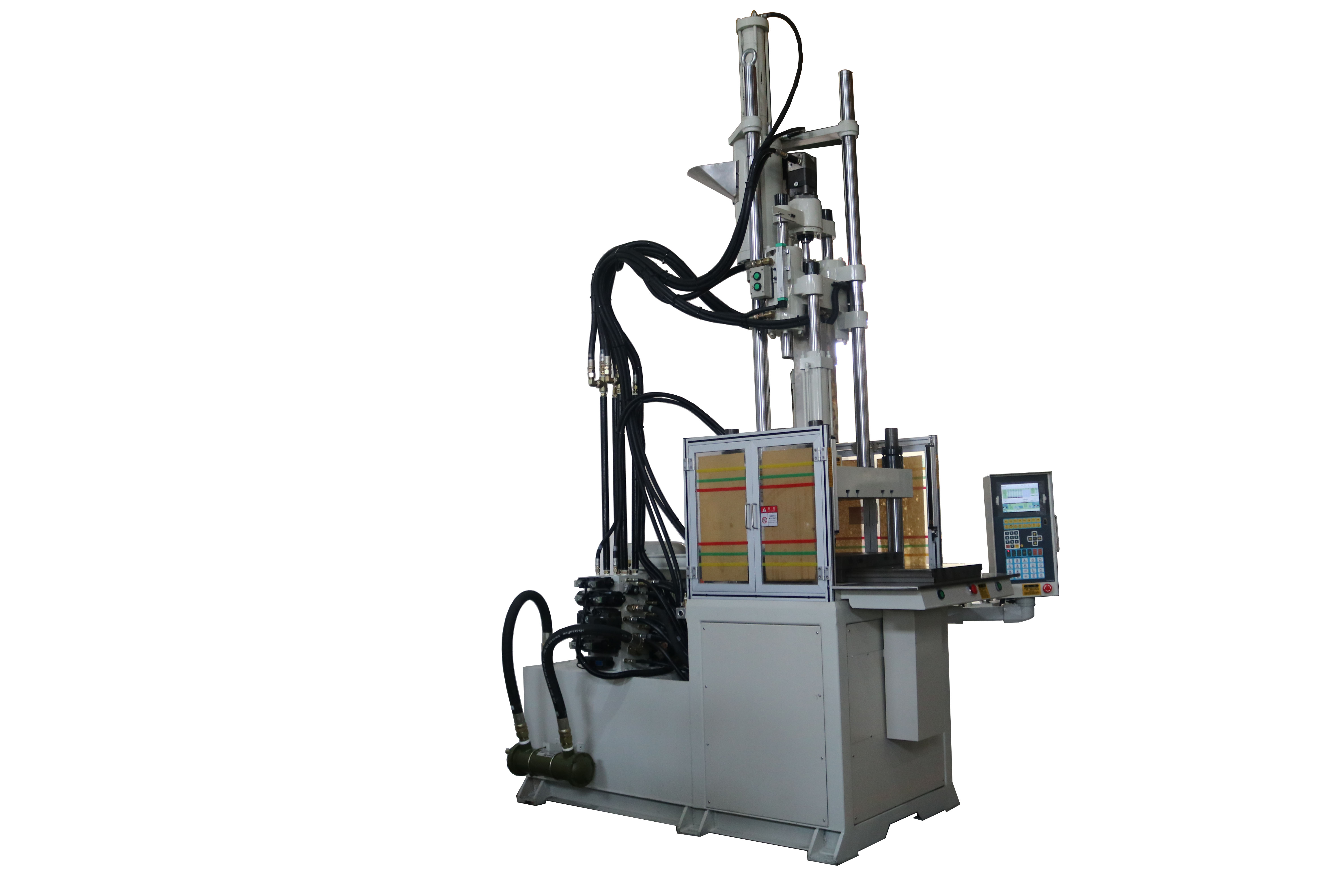 1、立式四柱直壓鎖模、立式射出、高速合模的塑膠注塑成型機(jī)。